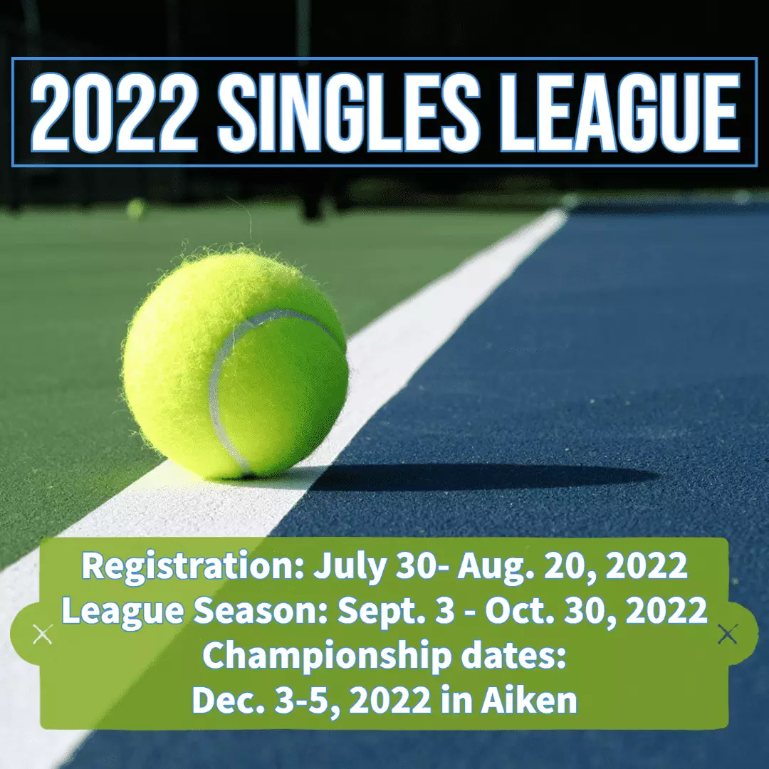 Singles League Registration begins July 30- August 20, 2022. Season will be September 3 – October 30, 2022. Championship dates are December 3-5, 2022 in Aiken