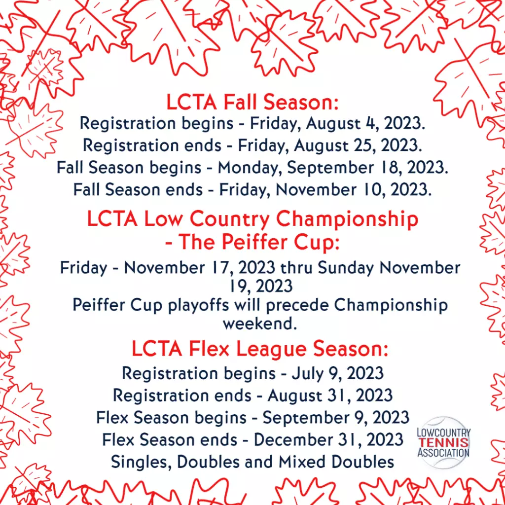 LCTA Fall Championship Season Registration Begins Soon LCTA Fall Season: Registration begins- Friday August 4, 2023 Registration ends – Friday August 25, 2023 Fall Season begins – Monday September 18, 2023 Fall Season ends – November, 10. 2023 LCTA Low Country Championship – The Peiffer Cup: Friday – November 17, 2023 thru Sunday November 19, […]