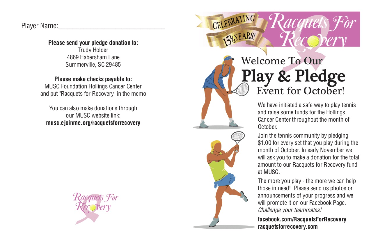 As many of you may already know, we made the difficult decision in August to cancel this year’s Racquets for Recovery tournament benefiting the Hollings Cancer Center at MUSC. However, we have a smaller, individual campaign that everyone can participate in!
